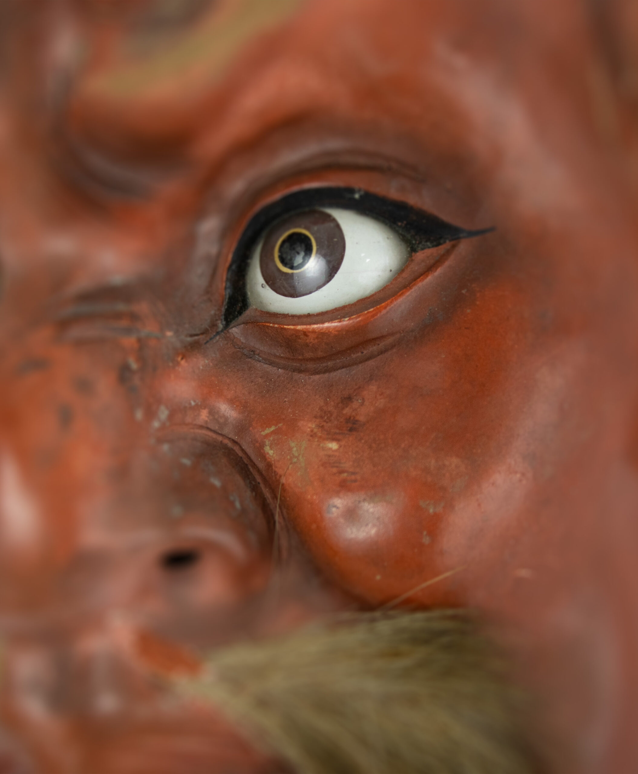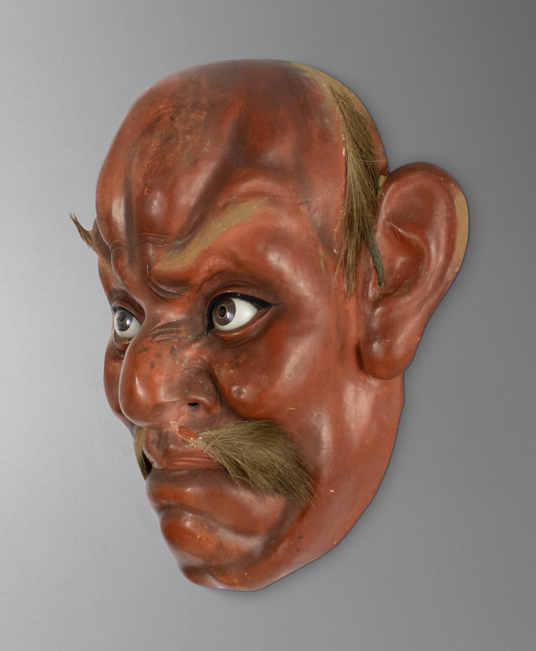 Crafted from carved wood which is lacquered and hand-painted, the Chinese character mask stands out for its super-realistic face with a wide forehead, glass eyes, large ears, thick nose, and well-defined lips. It also features natural hair, eyebrows, and a mustache.