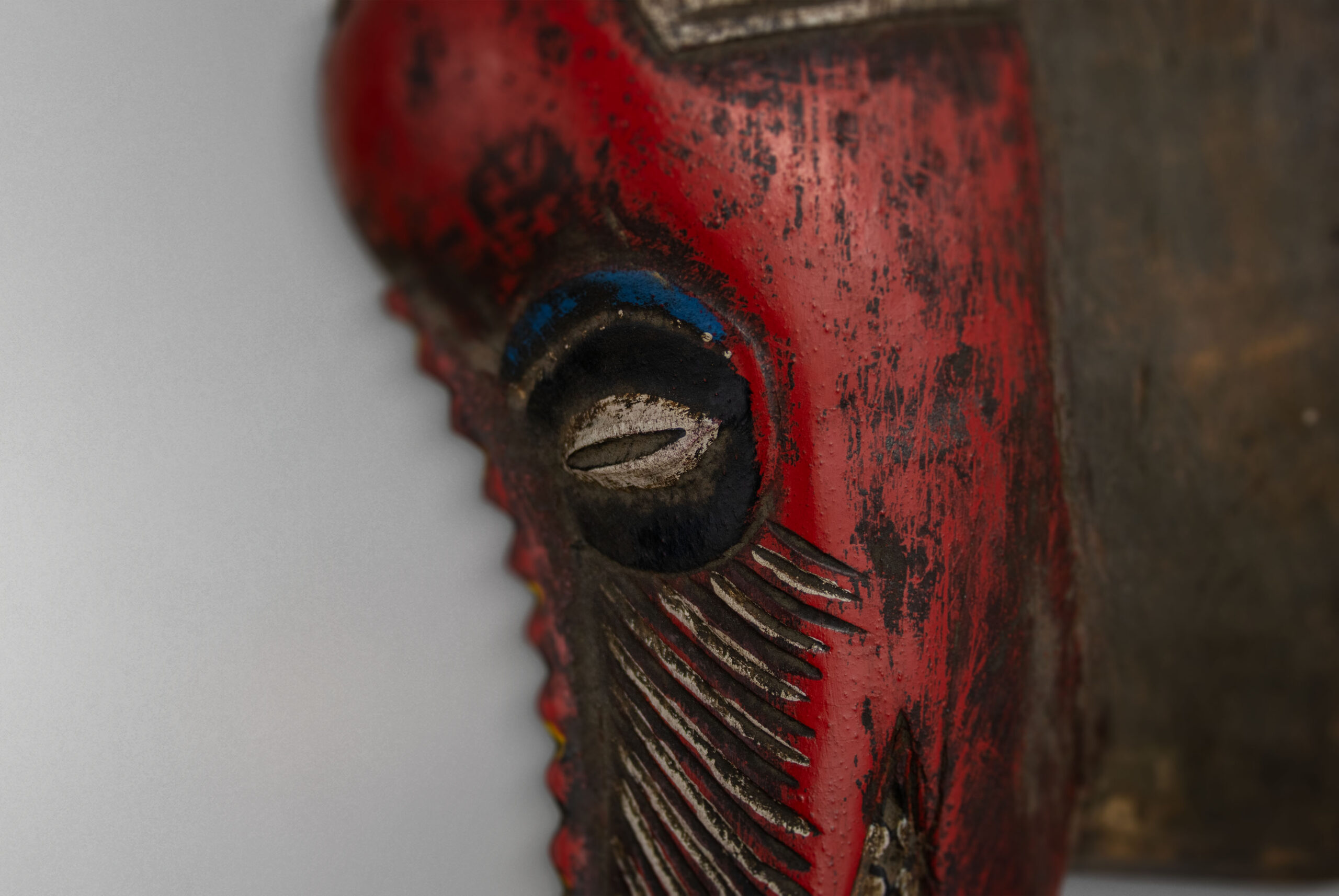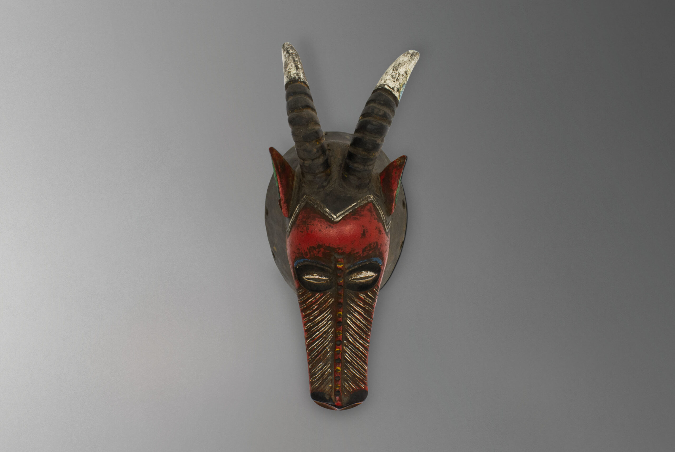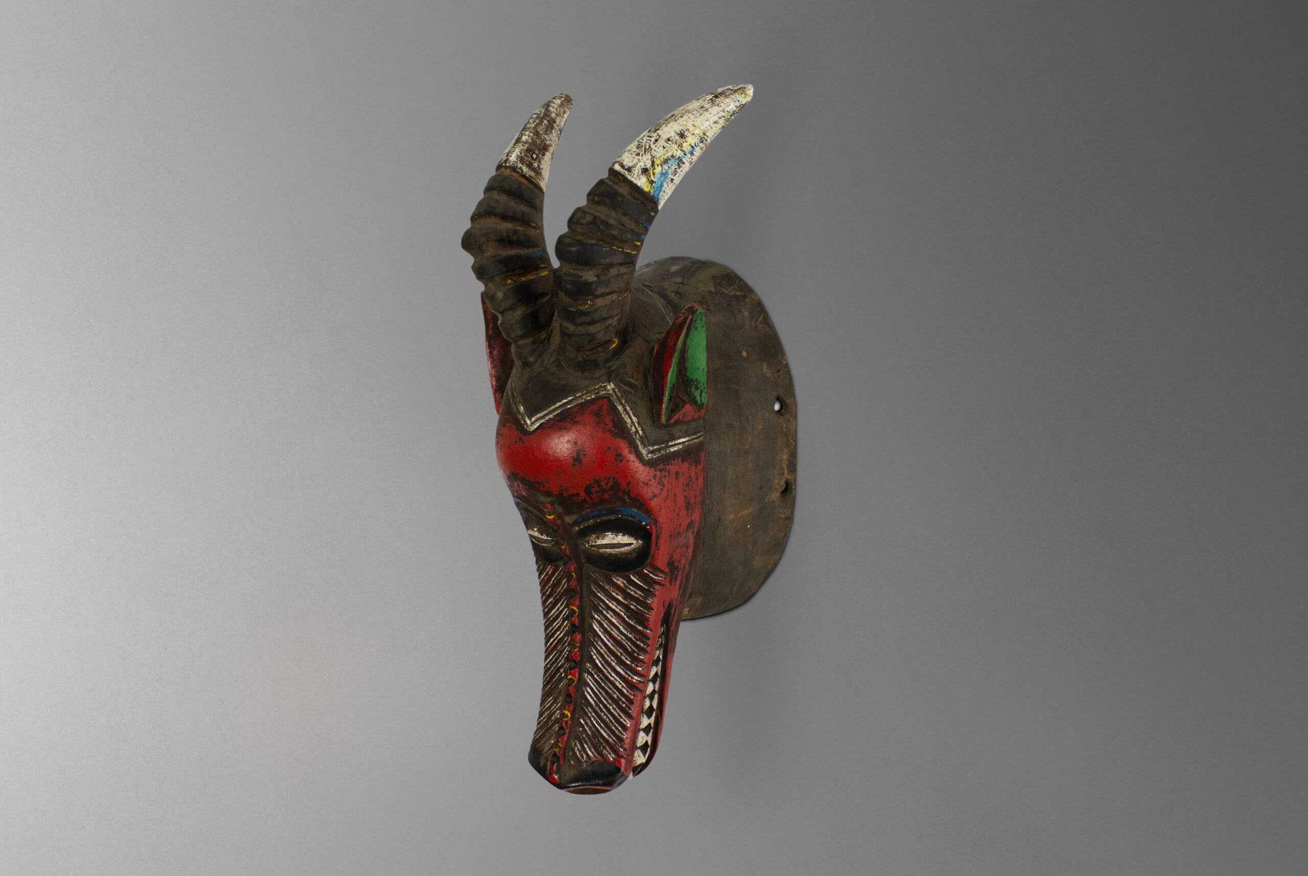 | Details | Hand-carved wooden mask highlights its mixed zooform shape with ram horns and crocodile head |